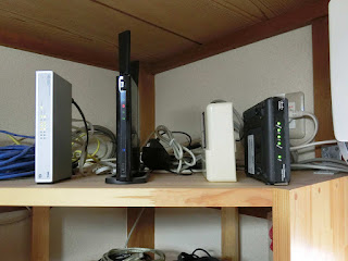 棚上には、右からケーブルモデム、TV用ブースター、無線LAN付きルーター、8ポートHUB、と、とりあえずこんな感じですかね。