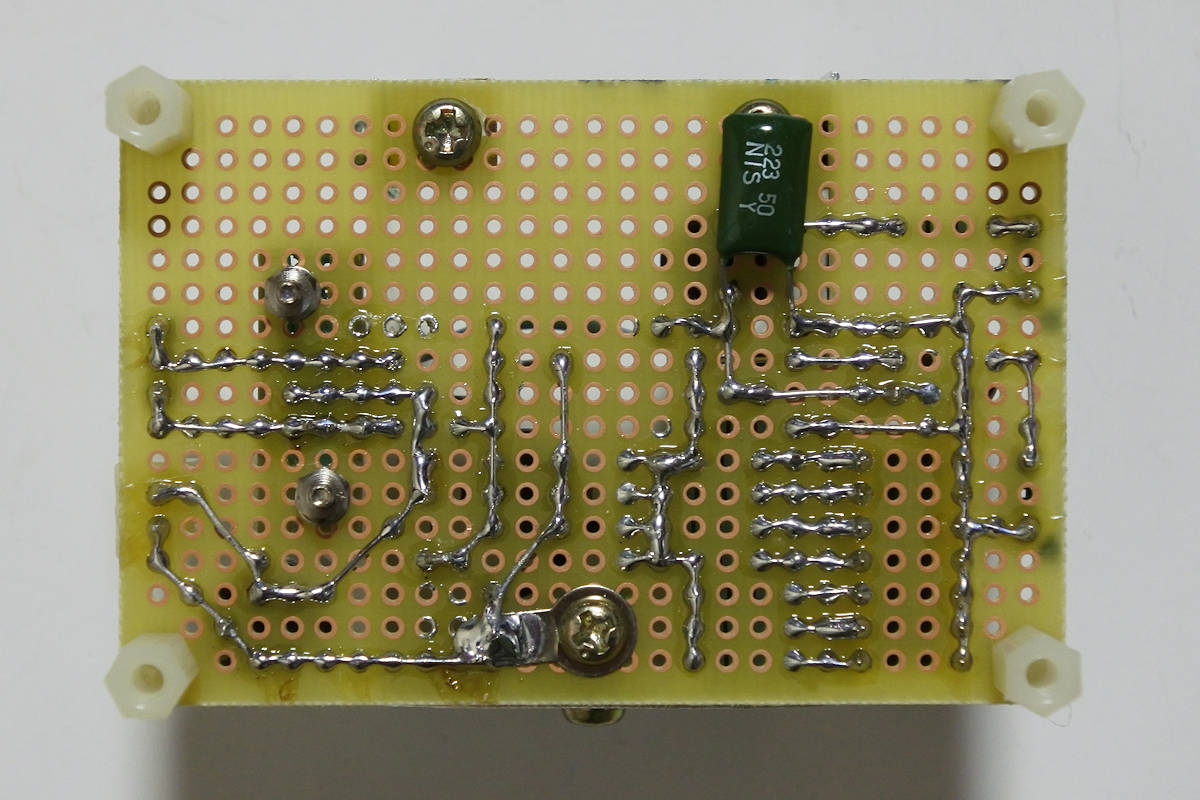 ちなみに、回路図中に “Sig IN” と記してある端子には低周波発振器から 400Hzとか 1KHzなどのキリの良い周波数の信号を入れ、“Sig OUT” には電子電圧計を接続しておく。 そして “Sig IN” に再度電子電圧計を接続し直して計測値を比較することで、100Ωの抵抗と FETの出力インピーダンスでどれだけ減衰するか、という比率から結果を求めて行く。 Excelで計算式を仕組んでおいて、計測した電圧を入力すれば出力インピーダンスが求まるようにしておけば便利ですな。
